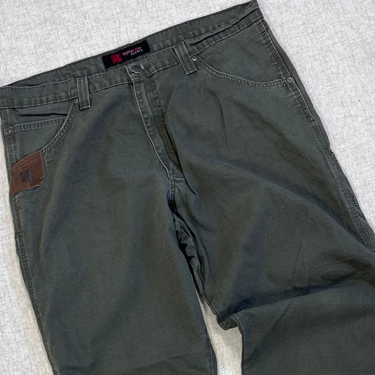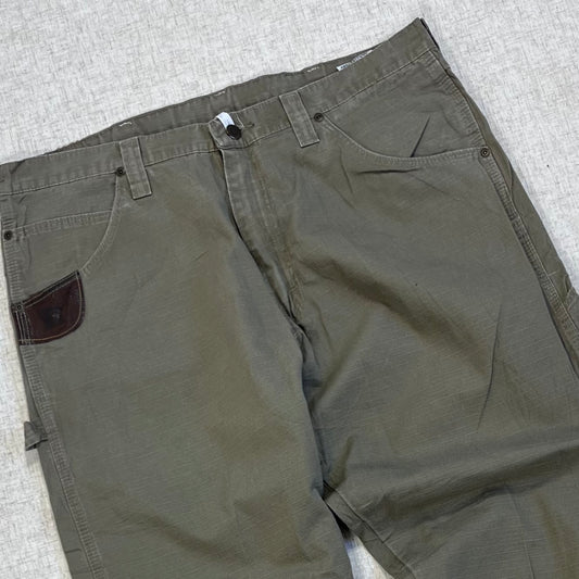 Thrifted – Jean Carpenter Verde Oliva Wrangler Riggs Talla 38x30 USA (CL 52–54) | Cintura 49 cm | Largo 103 cm | Talón 24 cm