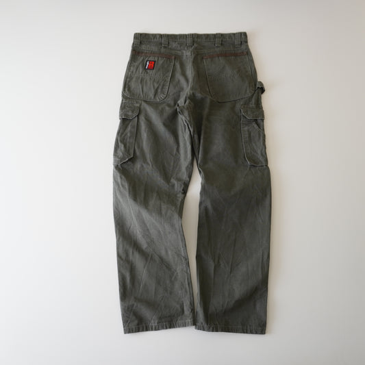 Thrifted – Cargo Carpenter Verde Oliva Wrangler Riggs Workwear Talla 34x32 USA (CL 44) | Cintura 45 cm | Largo 109 cm | Talón 23 cm
