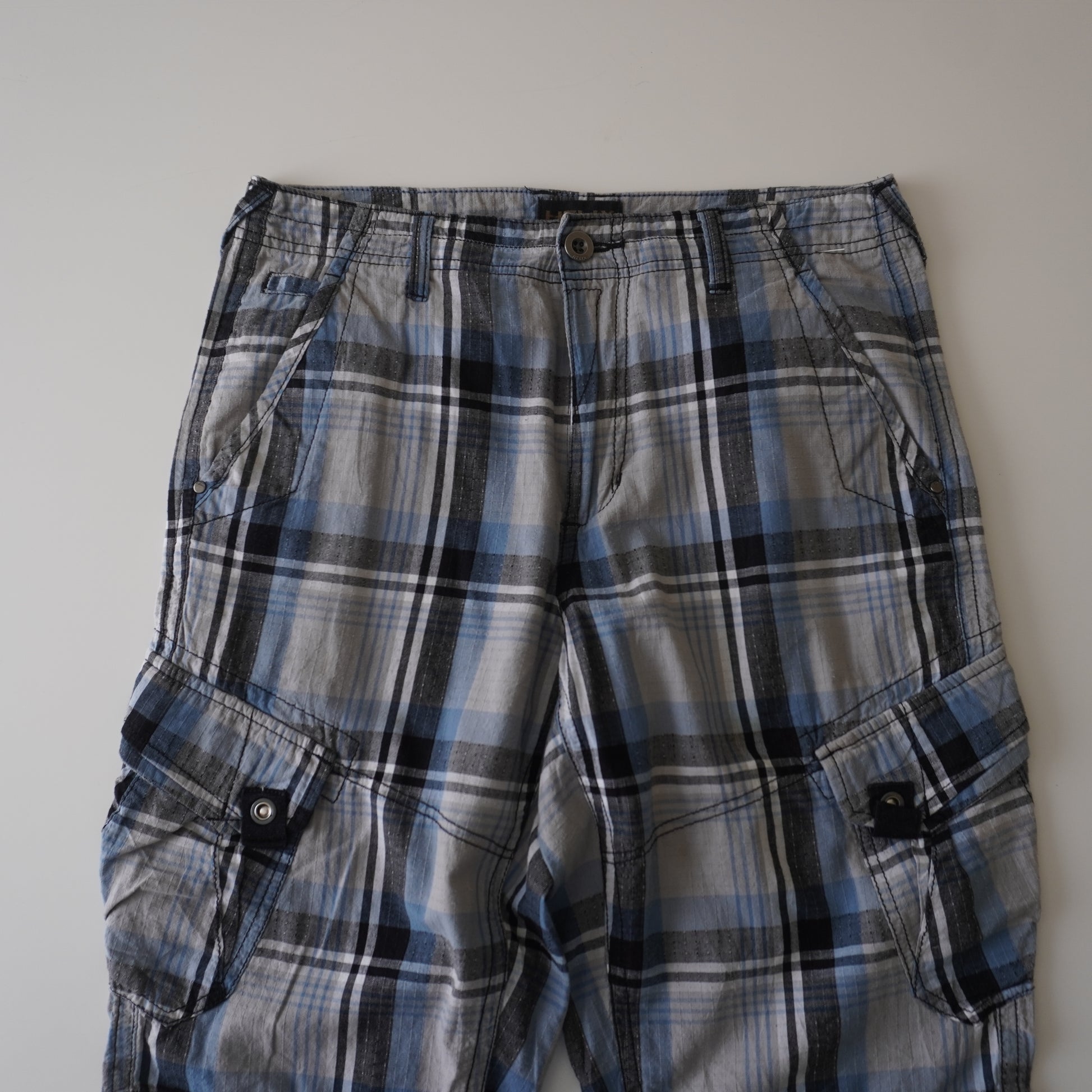 Thrifted – Short Cargo Escocés Negro, Blanco y Gris Helix Talla 30 USA | Cintura 42 cm | Largo 56 cm